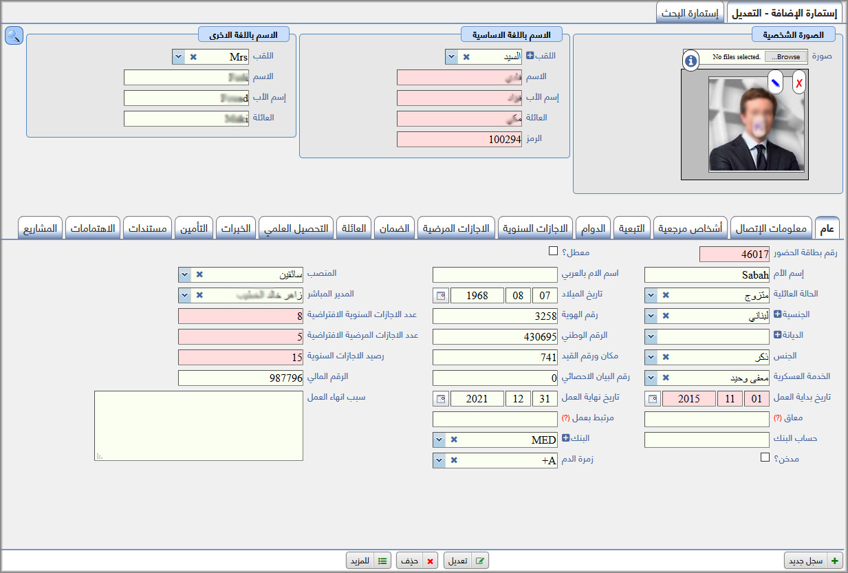 بطاقة الموظف نظامنا لإدارة شؤون الموظفين يسهل إدارة مختلف العمليات التي تتم داخل بيئة العمل سواء الإدارية أو الحسابية أو المتعلقة بالحفظ والأرشفة، حيث يوفر لكل موظف ملف كامل بكل بياناته الشخصية: