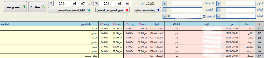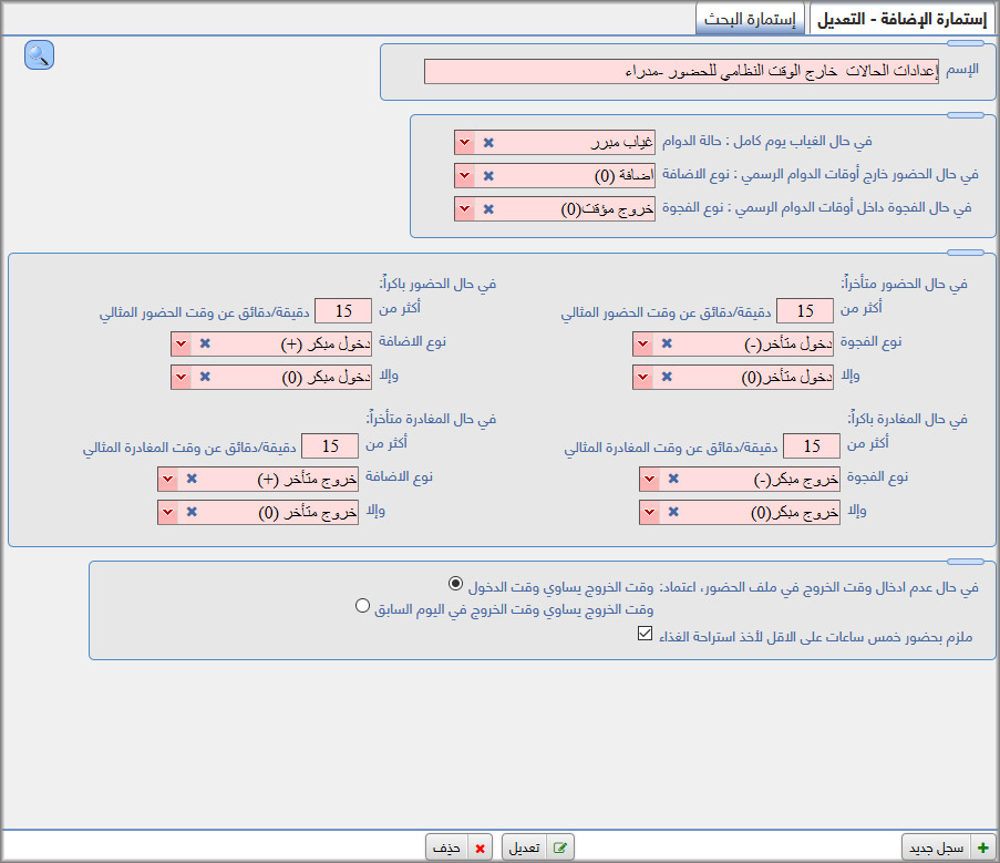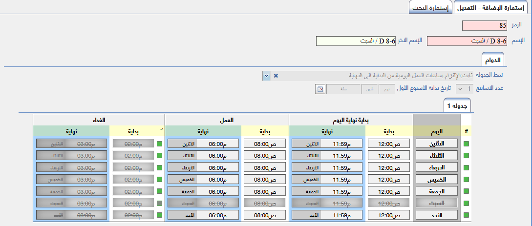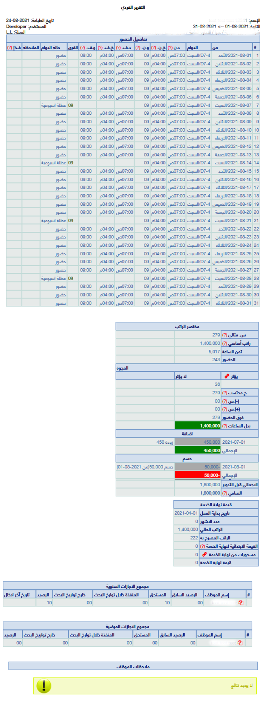 الثوابت العامة يتميز هذا النظام بالمرونة ب في التعامل مع كافة التقسيم الهيكلي للمؤسسة وذلك من خلال تعريف الهيكل الاداري الخاص بالمؤسسة وتعريف كافة البيانات المتعلقة بالنظام وإعداد الدوامات الإفتراضية كما يوفر النظام خاصية إدخال لائحة دوامات للموظفين وتحديد أنواع الفجوات والعطل والغياب ومدى تأثير كل منها على احتساب الراتب، كما بوفر النظام خاصية التعديل الجماعي للدوام وذلك لتوفير الوقت ولتسهيل التعامل مع النظام. |